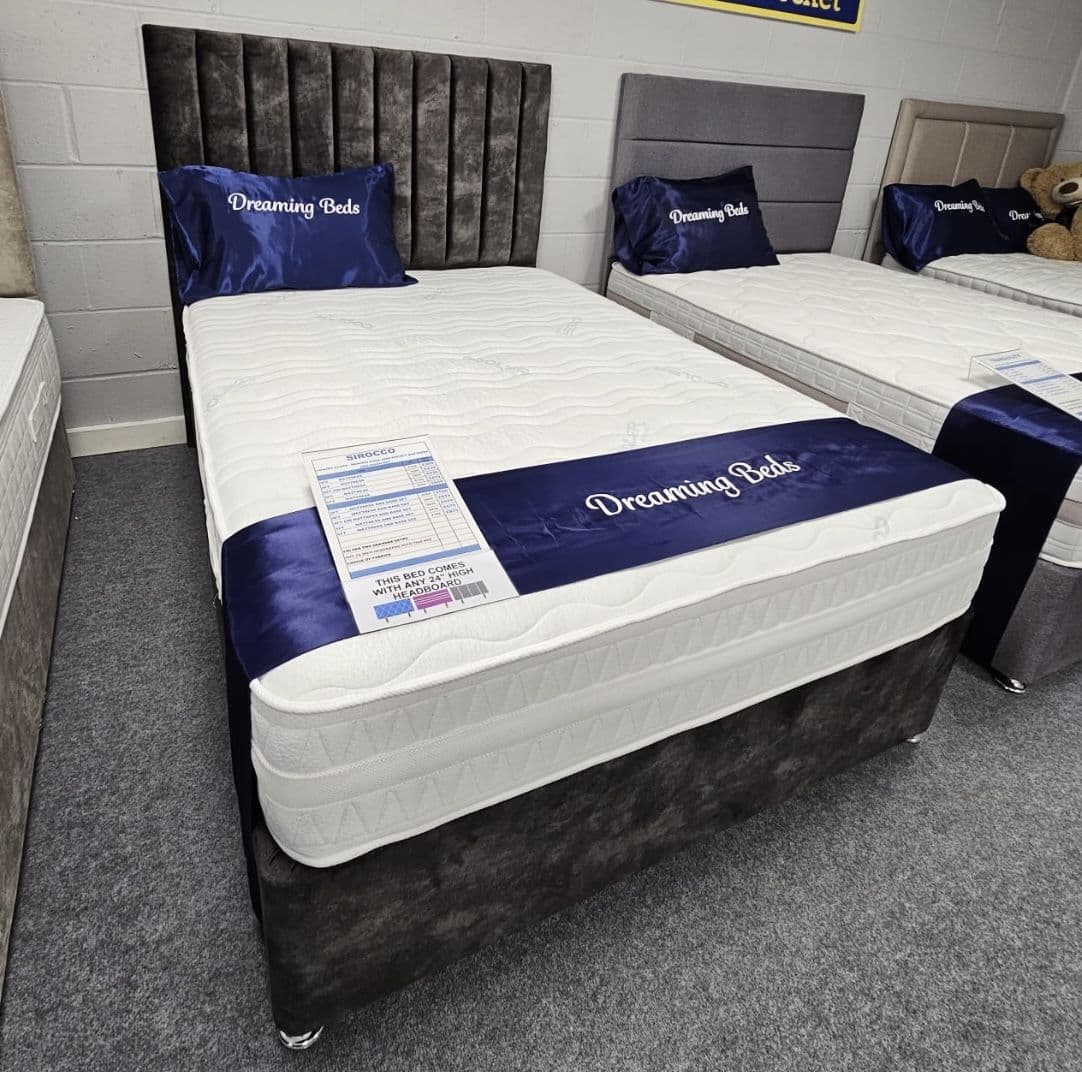 Price Includes: Sirocco 2000 Pocket Mattress + Durable Divan Base + Strutted Headboard (headboard can be upgraded to floor standing 54" for an additional charge)